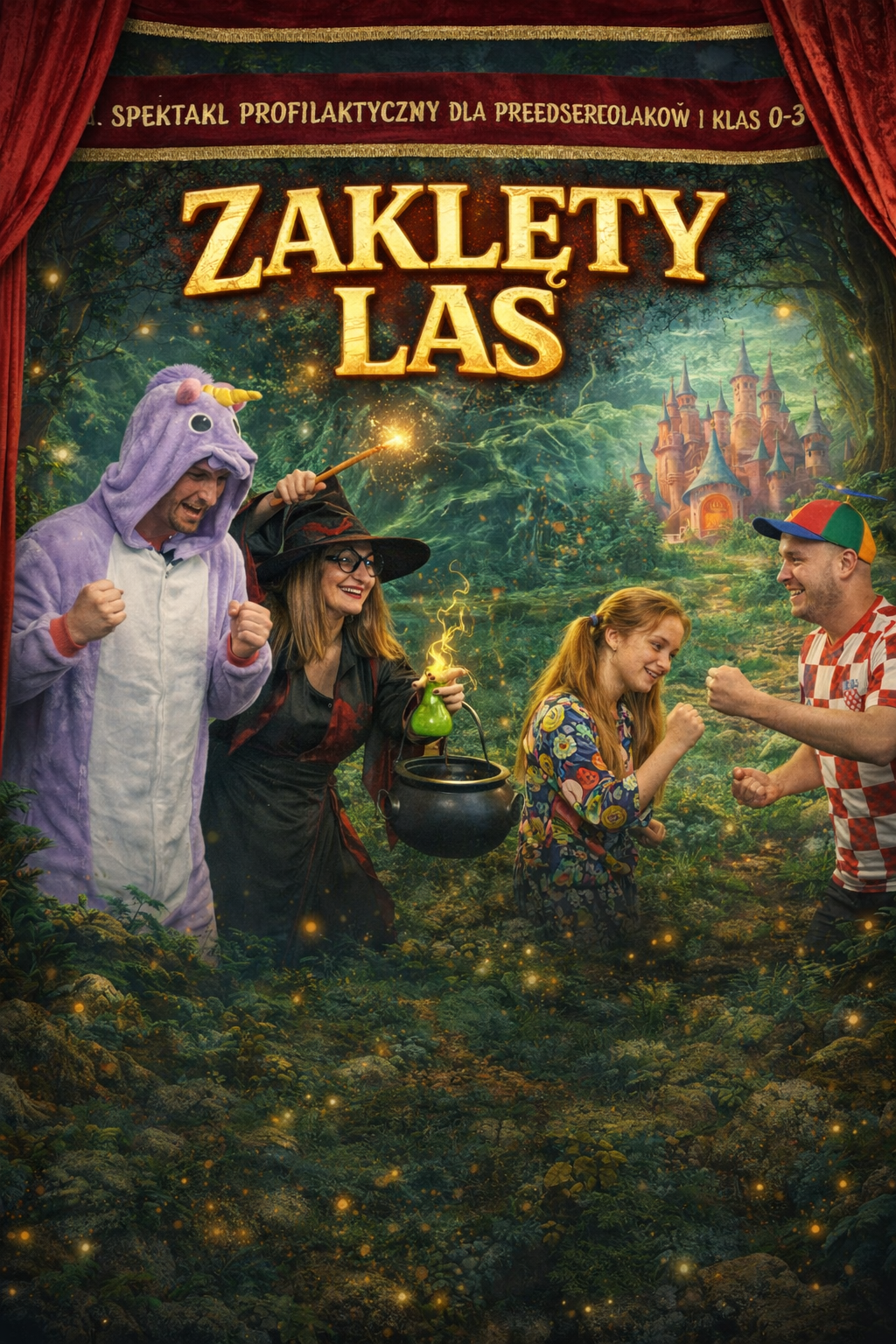 Zaklęty las to spektakl adresowany do przedszkolaków i uczniów klas 0-3 szkół podstawowych. Jest to historia niesfornego rodzeństwa Franka i Mai, które znajduje tajemniczą mapę na strychu swojego domu. Podczas zabawy dochodzi do kłótni między rodzeństwem i przypadkowo rozdzierają mapę na dwie części. Franek i Maja postanawiają, że każde z nich pójdzie drogą według swojej części mapy, żeby sprawdzić dokąd ich zaprowadzi. Niestety będąc w środku lasu Franek gubi swoją połowę mapy. Wpada w panikę ponieważ nie wie gdzie dokładnie się znajduje i którędy ma wrócić do domu. Miotając się pomiędzy drzewami trafia na domek z tablicą zakazu wstępu. „Zakazy są po to żeby je Łamać” pomyślał i wszedł do środka. Okazało się, że mieszka tam urocza wiedźma o imieniu Grażyna która w swoim ADHD nie kontroluje czystości i porządku. Okazuje się także, że Grażyna ma bardzo małą wiedzę na temat szkodliwości alkoholu. Gdyby nie nagłe pojawienie się chłopca mogłaby popełnić duży błąd. W pewnym momencie w całym tym bałaganie dochodzi do przypadkowego zamienienia Franka w jednorożca. Aby odczarować chłopca i pozwolić mu bezpiecznie wrócić do domu, Franek i Wiedźma muszą połączyć siły. Kluczowa w tym okażę się wiedza o zdrowym odżywianiu i aktywność ruchowa czyli sprawy o których Wiedźma Grażyna nie ma zielonego pojęcia.